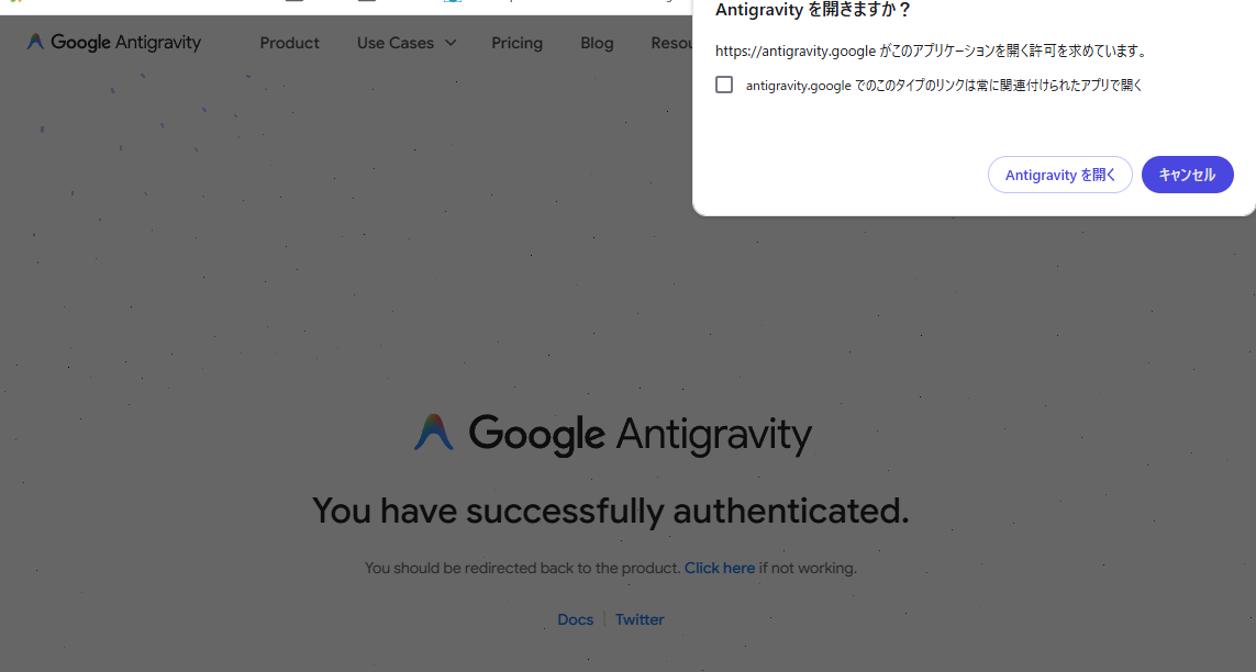 ブラウザの認証成功画面で「Antigravityを開く」ボタンが反応しない場合: