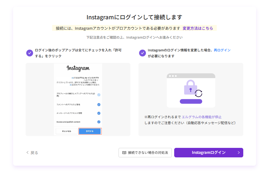 Q: Instagramのパスワードを変更したらどうなりますか? A: エルグラムとの接続が切れるため、再ログインが必要です。再ログインするまで自動応答やメッセージ配信が停止します。管理画面から再接続してください。
