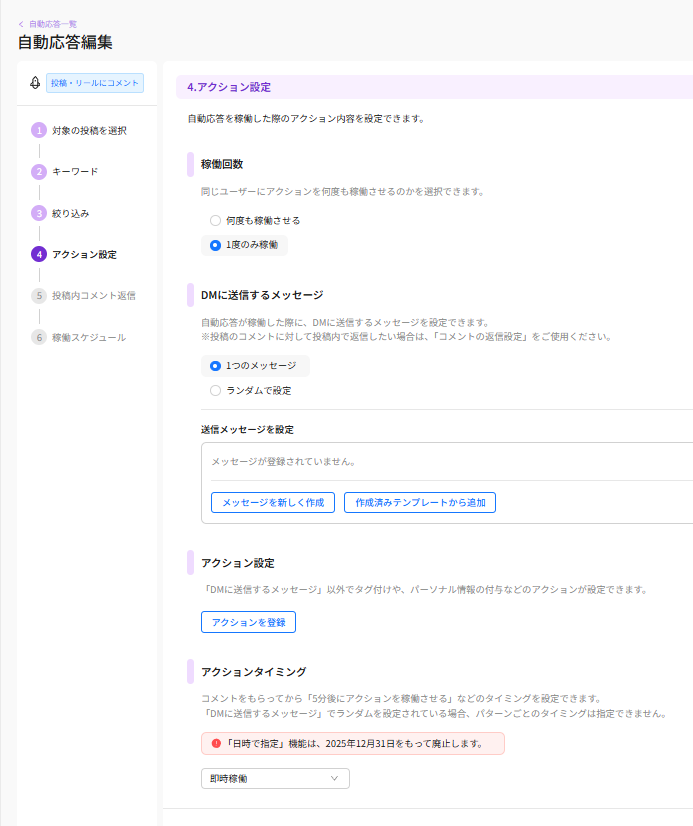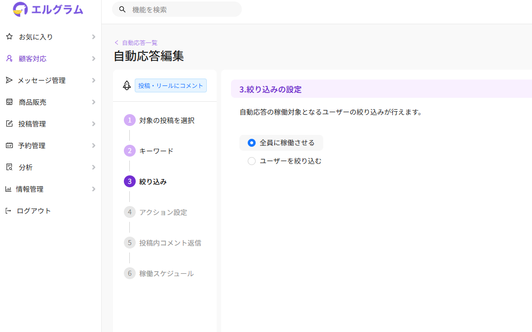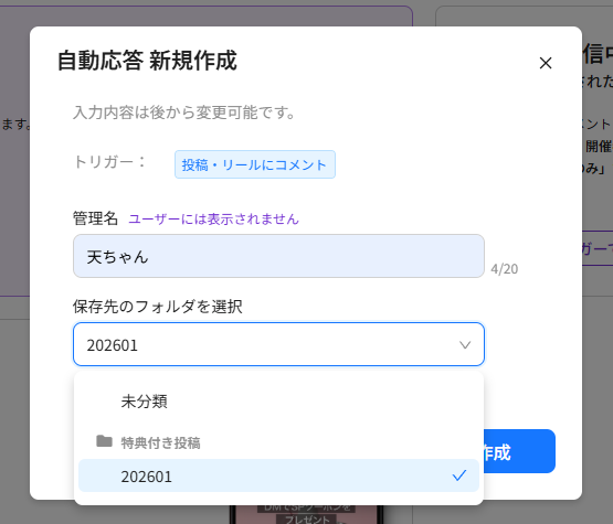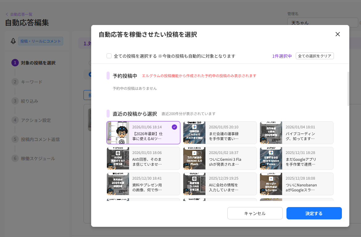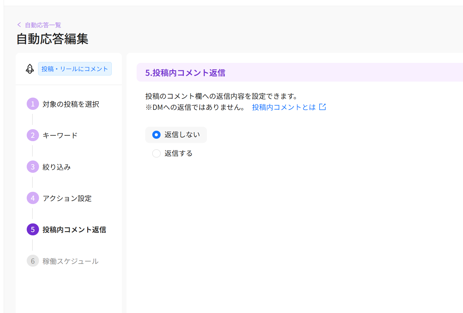 Q: 既存の投稿にも自動応答を設定できますか? A: はい。「特定の投稿」を選択して、既存の投稿に対しても自動応答を設定できます。