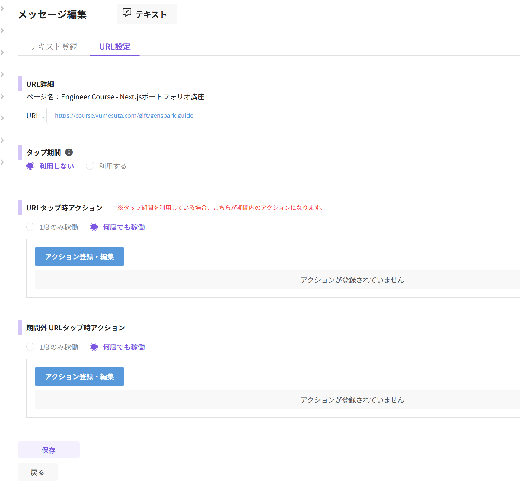 「URL設定」タブでは、URLのタップ時アクションを設定できます: