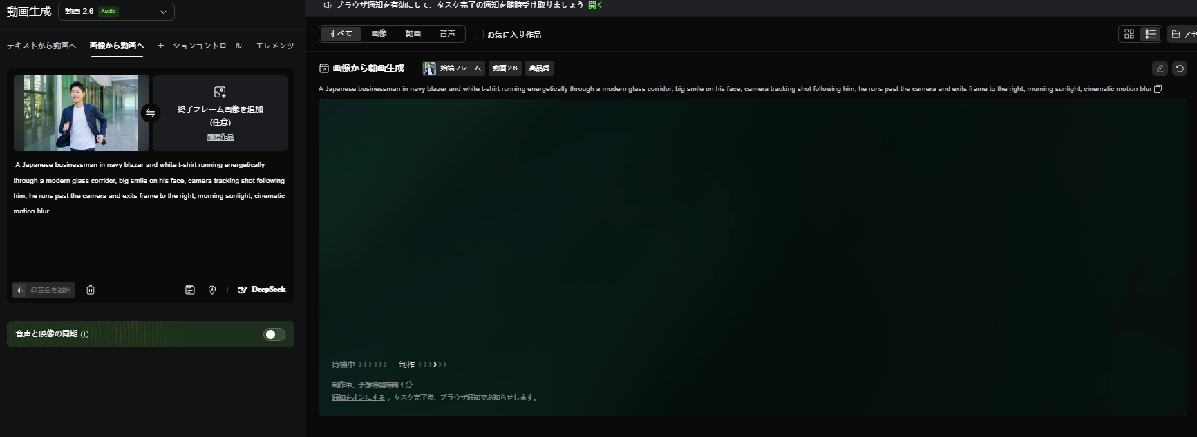 | Image-to-Video | 画像を元に生成 | 特定の人物・背景を使いたい時 |