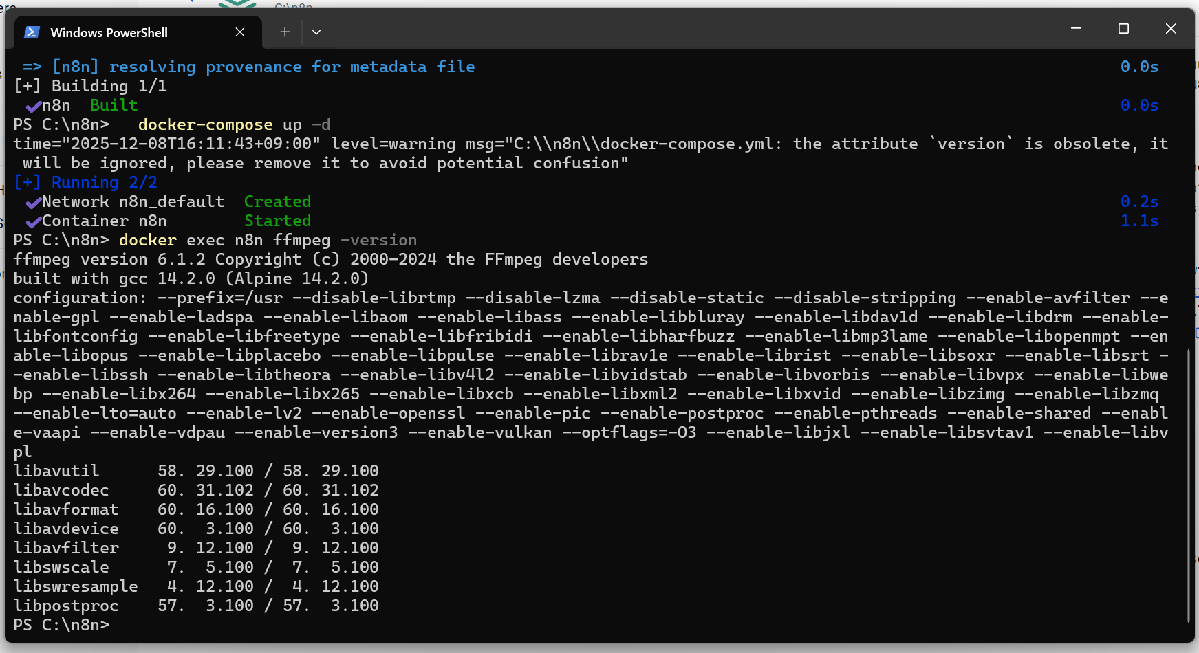 docker exec n8n ffmpeg -versionでバージョンが表示される