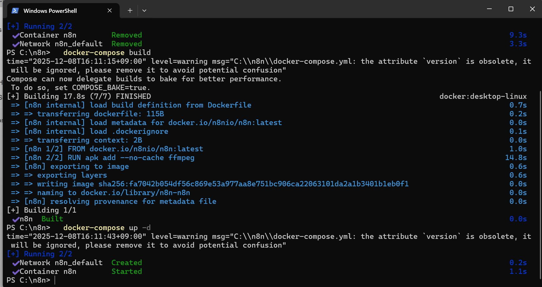 FROM n8nio/n8n:latest- 公式n8nイメージをベースにするUSER root- インストールのためroot権限に切り替えRUN apk add --no-cache ffmpeg- ffmpegをインストールUSER node- セキュリティのためnodeユーザーに戻す