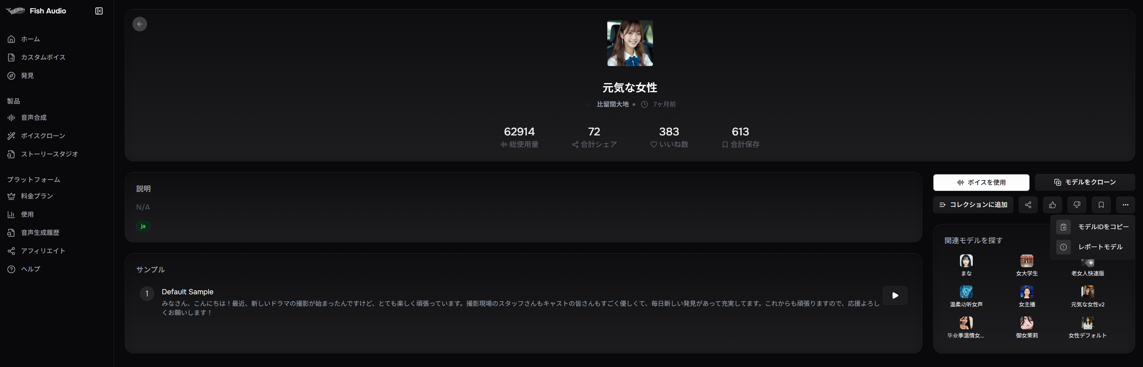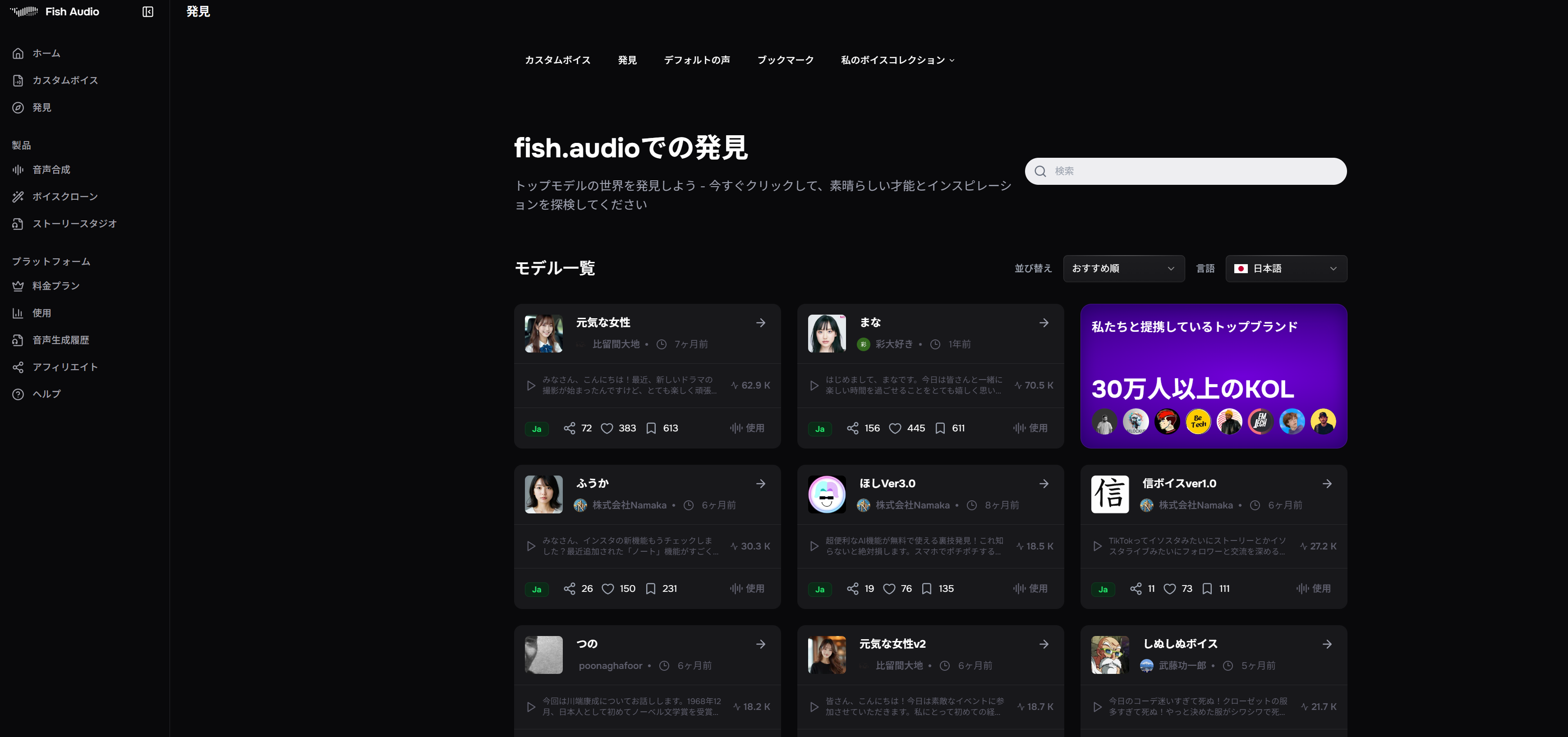 Q: 日本語以外の音声も使えますか? A: はい。Fish Audioは英語、中国語、韓国語、フランス語、ドイツ語など多言語に対応しています。「発見」ページで言語フィルターを変更して探せます。
