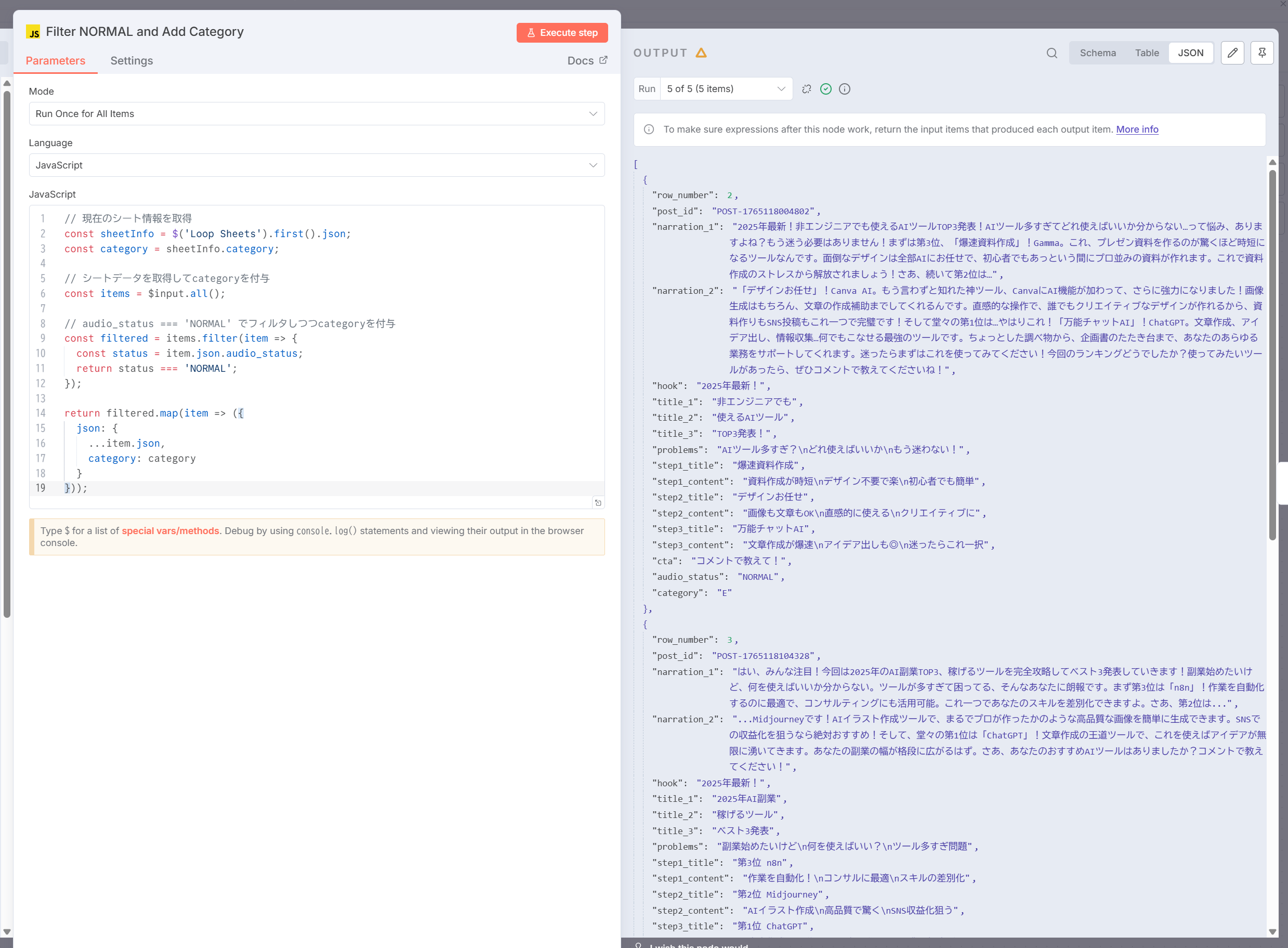 Q: audio_statusがNORMAL以外の行はどうなりますか? A: Filter NORMAL and Add Categoryでフィルタされ、処理対象から除外されます。既にDONEの行や、空の行は処理されません。