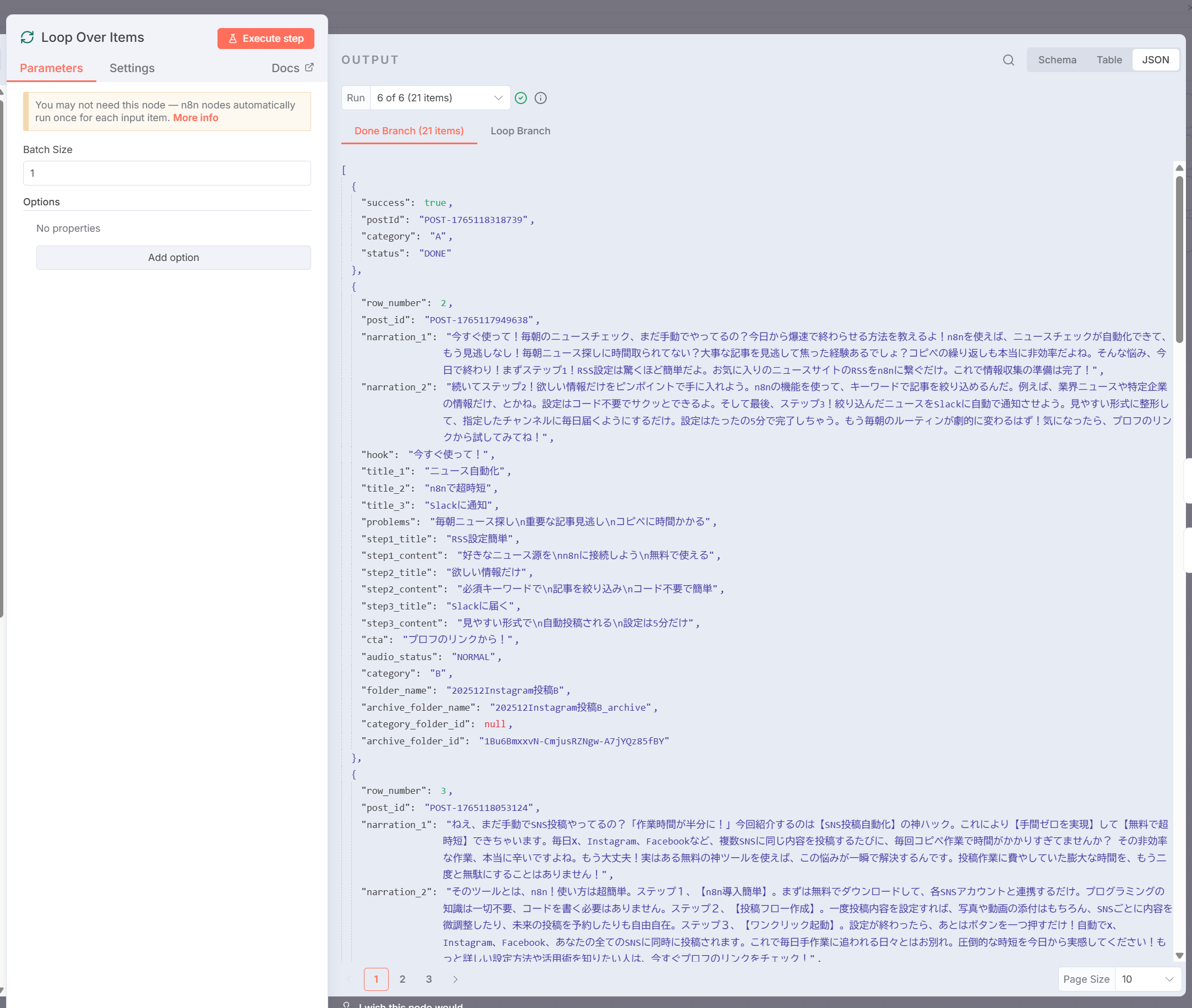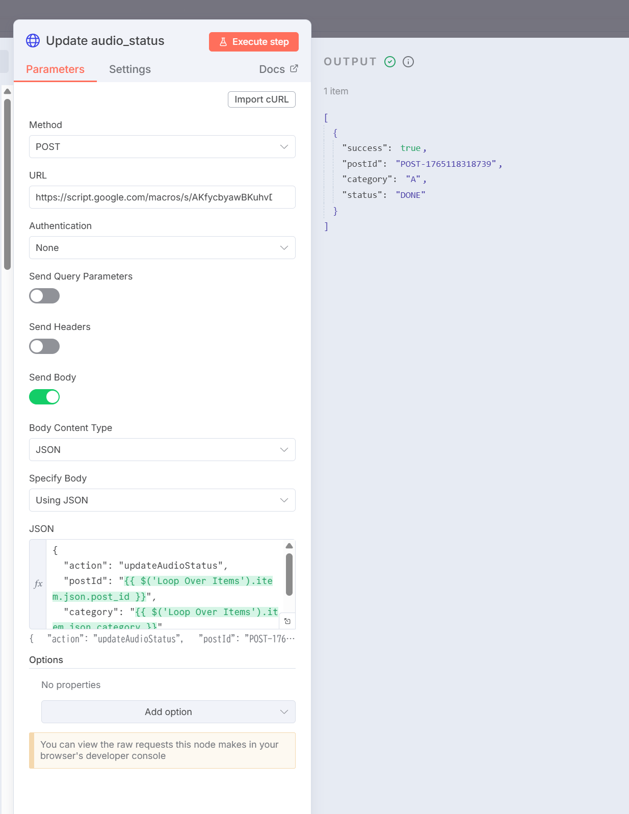- Update audio_statusの出力をLoop Over Itemsの入力に接続