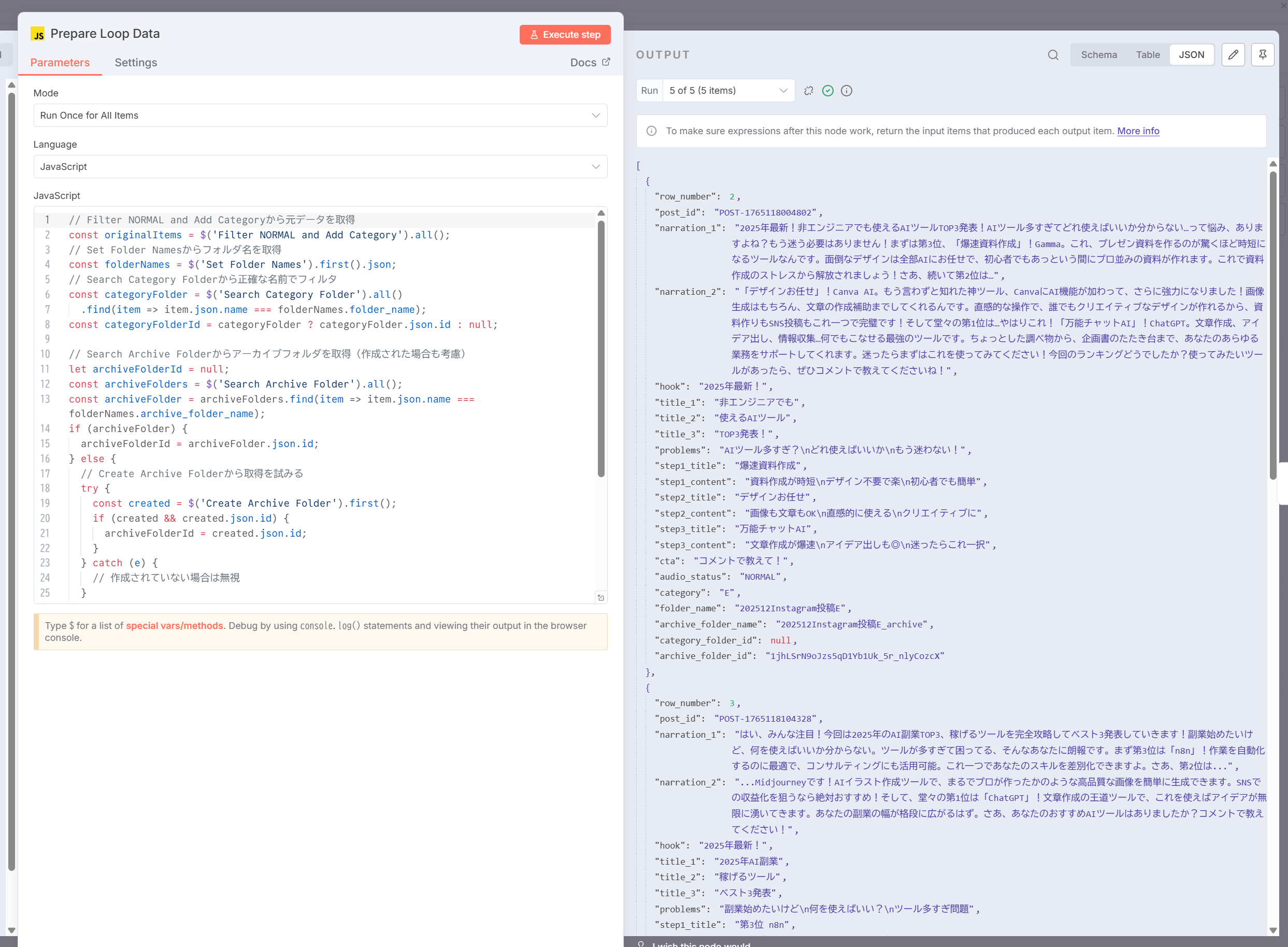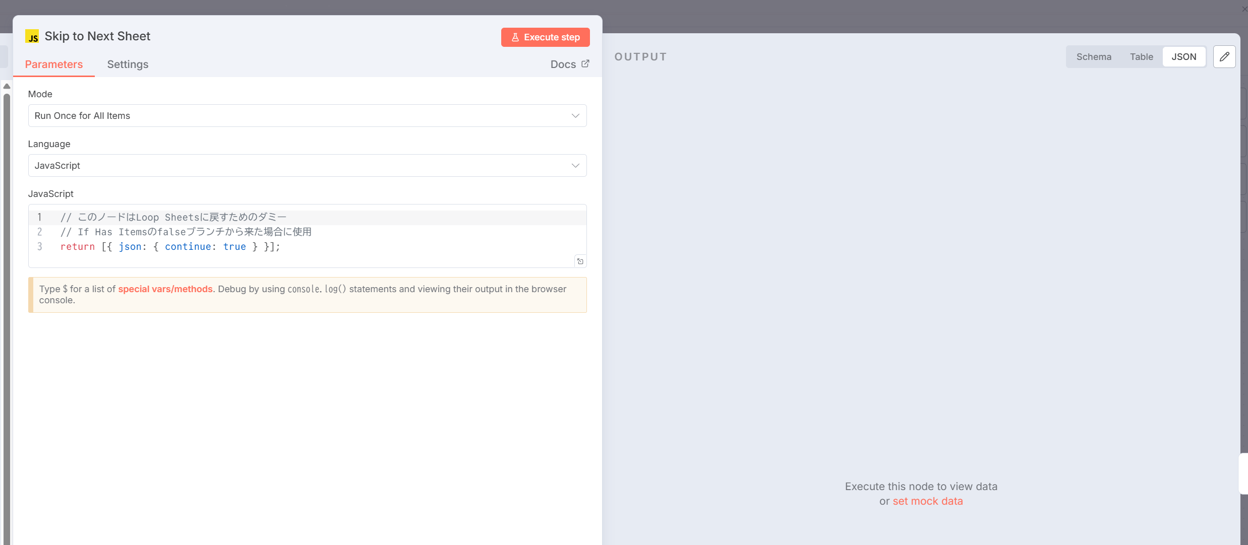 原因: Codeノードで$('Loop Sheets').item.jsonを使用している