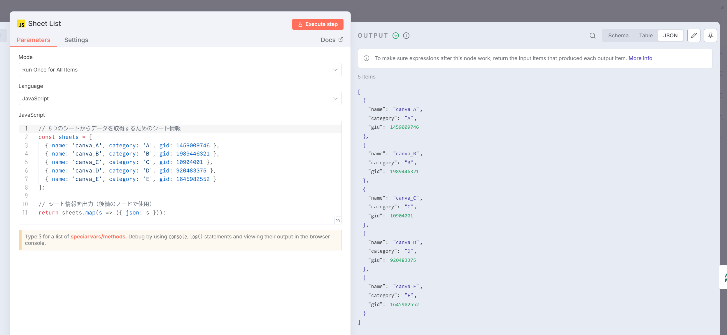 | Sheet ID | {{ $json.gid }}(Expressionモード) |