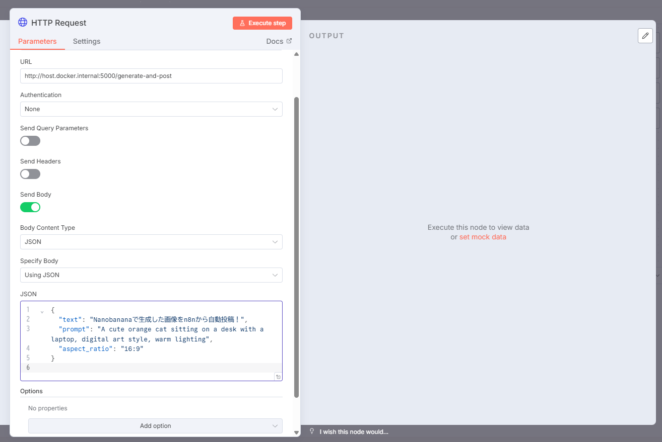 /generate-and-postに設定した - JSON形式でtext, prompt, aspect_ratioを設定した