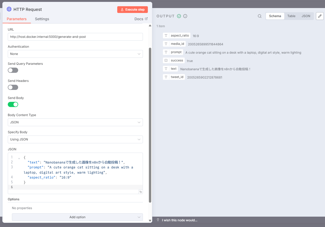 "text": "Nanobananaで生成した画像をn8nから自動投稿!",