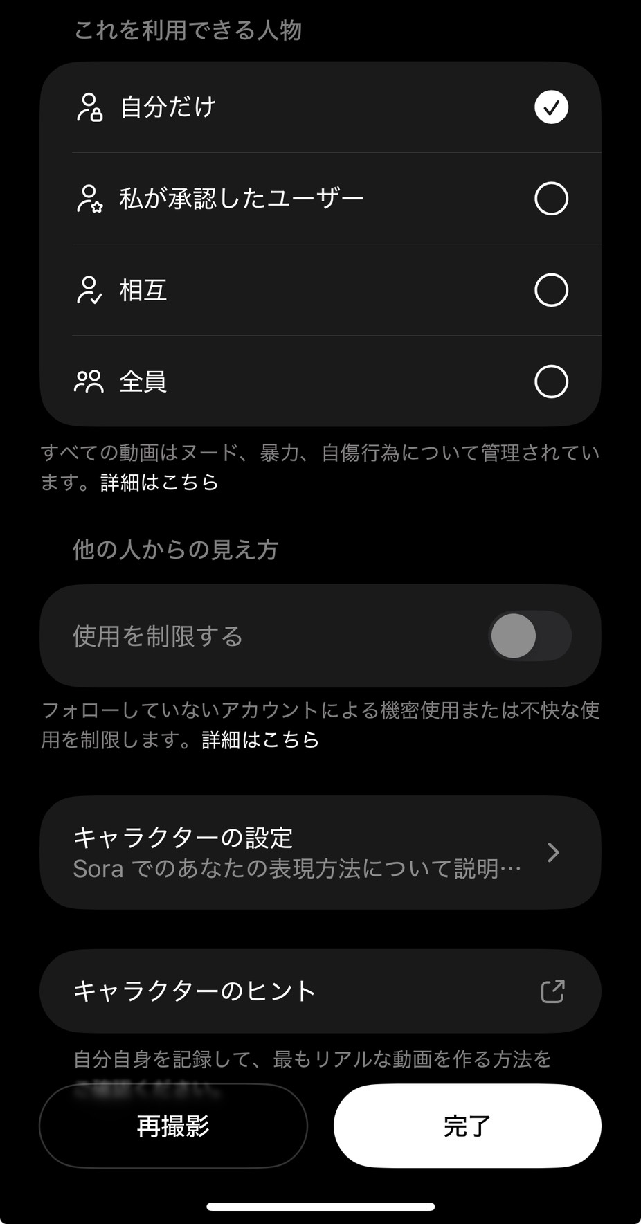 公開設定を「全員」にすると、世界中の誰でもあなたのキャラクターを使って動画を作成できてしまいます。